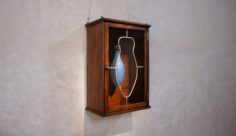 d’un objet étrusque découvert à la Villa de Giulia : le lacrymatoire. Ces petits flacons en verre soufflé, supposés recueillir les larmes des proches du défunt et souvent retrouvés près des tombeaux, revêtent pour moi une dimension à la fois poétique et émouvante, rappelant des flacons de parfum contenant des fluides corporels. J’ai ainsi conçu un lacrymatoire en verre recyclé dont la surface hérissée et aux aspérités multiples lui confère une beauté singulière, donnant un aspect vivant et irrégulier. Sa forme évoque à la fois des poumons et des seins, tandis que la petite goutte finale caractérise l’essence même du lacrymatoire. L’idée est que ce récipient recueille les larmes d’une femme ou de la Terre — des larmes célestes, symboles d’une pluie nourricière — afin de nourrir et engendrer une terre nouvelle, fertile, et d’ouvrir un nouveau chemin. Pour renforcer son caractère mystique, j’ai installé cette pièce dans une vieille armoire, qui rappelle un tabernacle d’église. Bien que placée en retrait, l’oeuvre, encadrée et mise en valeur par son écrin, dégage une force spirituelle, son fluide ne devant être utilisé qu’en cas de grande nécessité.